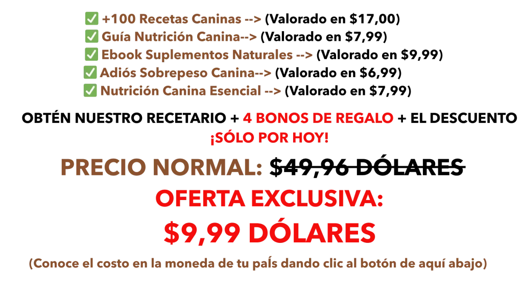 Si tu perro tiene una condición médica especial, siempre recomendamos consultar primero con tu veterinario pero este recetario es 100% natural, sin condimentos, harinas procesadas ni conservantes.